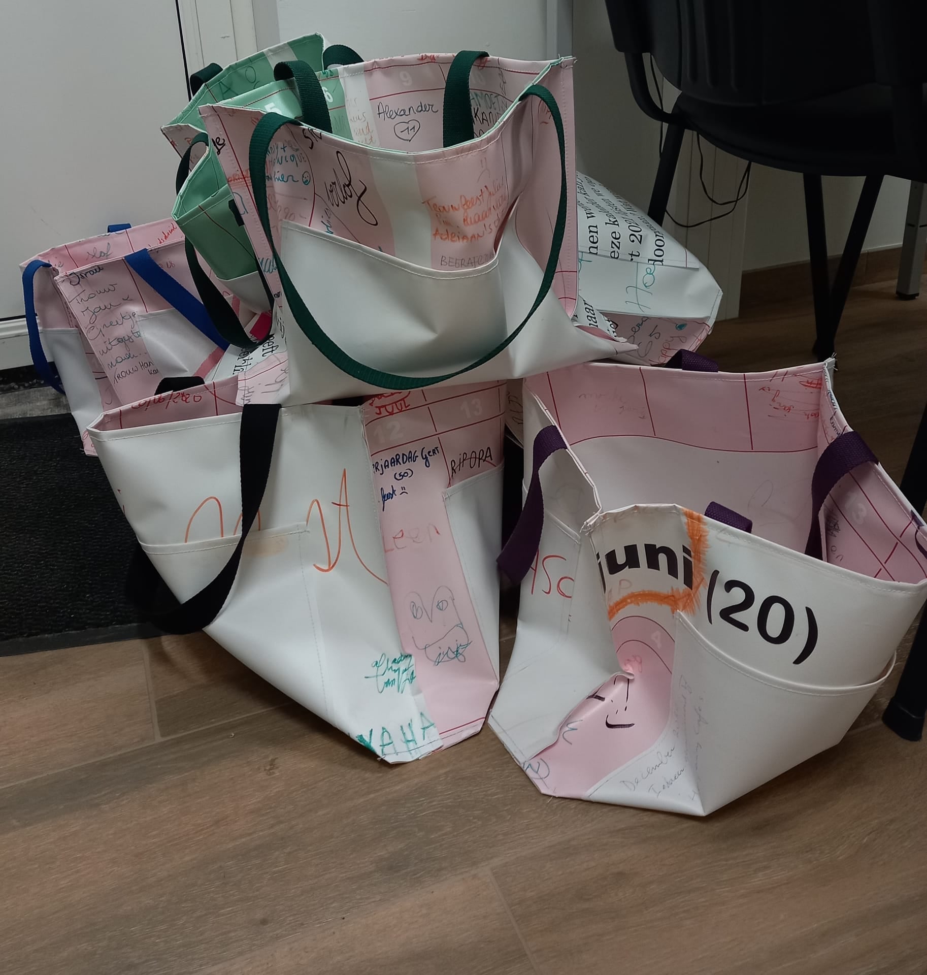 Die kalenders zijn een bijzonder tijdsdocument geworden. We vroegen aan Mekanders uit Oud-Turnhout of zij er binnen hun beschutte werkplaats een herbestemming aan wilde geven. En dat deden ze, in de vorm van 14 super-de-luxe en erg kwalitatieve shoppers. Ze waren in een mum van tijd uitverkocht en zijn erg geliefd bij wie er eentje kon bemachtigen.